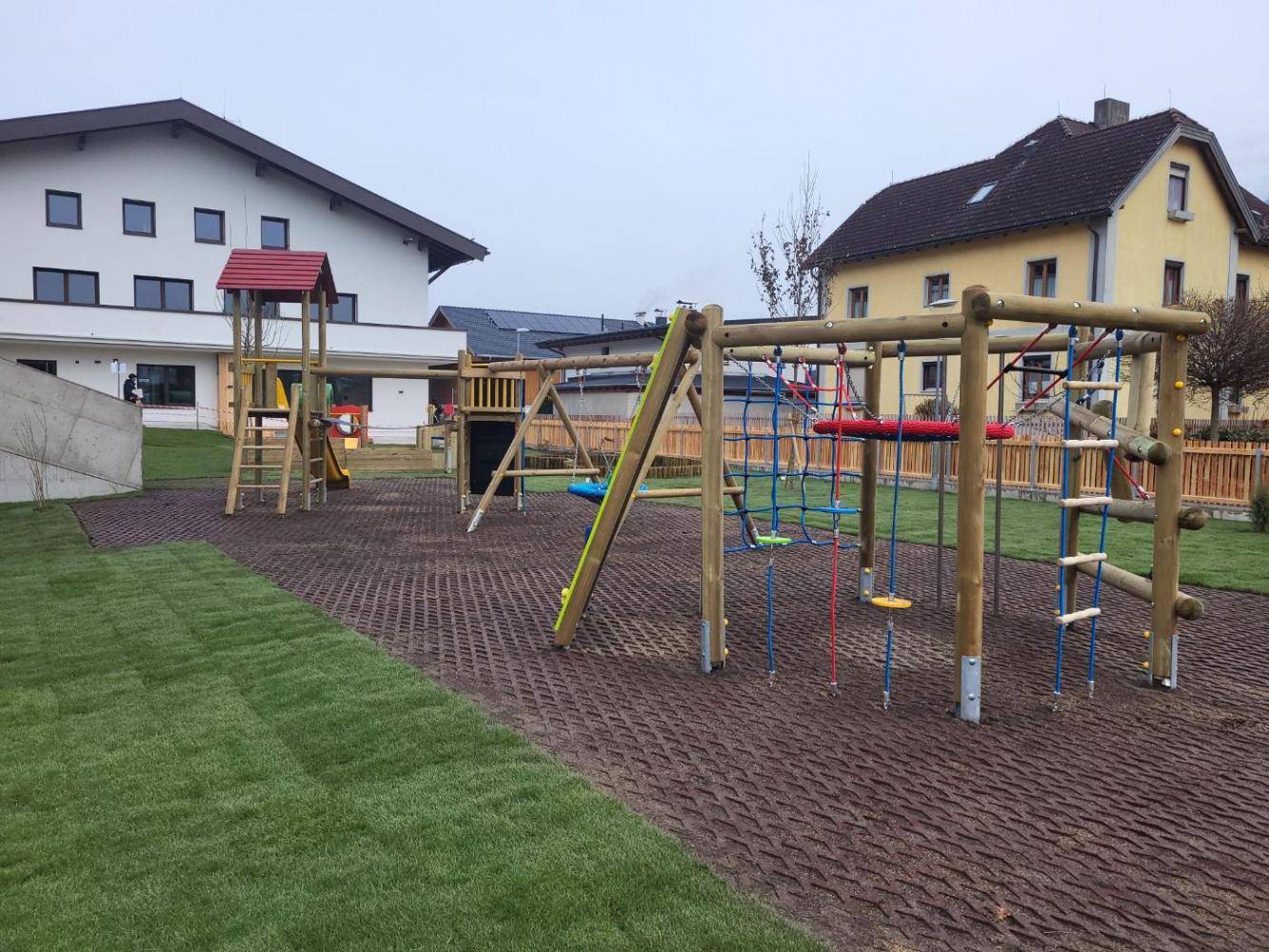 Die Arbeiten an der Außenanlage kommen ebenfalls gut voran. Die Fläche rund um das Gebäude ist bereits hergestellt; einzig der Gartenspielplatz folgt wie vorgesehen zu einem späteren Zeitpunkt. Am alten Gemeindehaus wurden Fenster, Fassade und Dach vollständig saniert. Der Sonnenschutz, die Entwässerung sowie der neue Bodenbelag am Balkon wurden fertig umgesetzt.