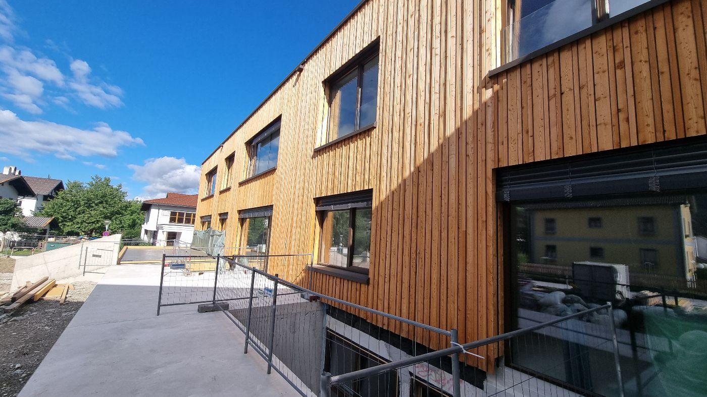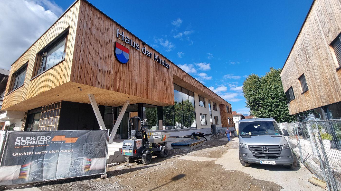 Von außen wird inzwischen bereits an der Holzfassade gearbeitet. Das „Haus der Kinder“ nimmt damit Schritt für Schritt seine endgültige Gestalt an.