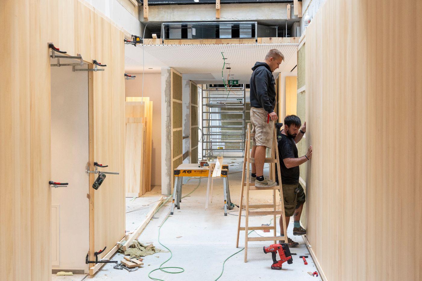 Im Inneren sind die Elektro- und HKLS-Installationen deutlich sichtbar und die Trockenbauwände sowie Unterkonstruktionen für die abgehängten Decken größtenteils montiert. Auch die Lüftungskanäle sind bereits eingebaut und die ersten Bereiche mit Akustikdecken versehen.